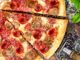 Are you looking for a pizza that will blow your taste buds away? Look no further! This delicious pizza is generously topped with mouth-watering salami, savory Italian sausage, and crispy pepperoni. Every bite celebrates flavor that will satisfy any meat lover's craving. Don't settle for boring pizza - try our exciting creation today.
